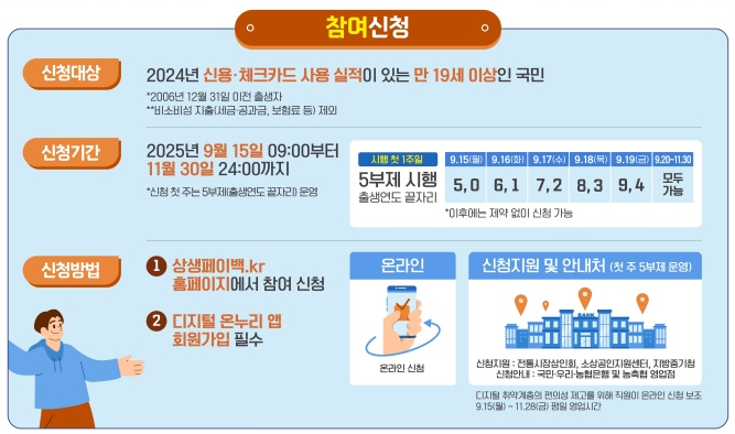 - 신청 자격: 대한민국 국민 및 외국인 등록증 소지자 중 **만 19세 이상(2006년 12월 31일 이전 출생)**이며, 지난해 신용·체크카드 실적 보유자.