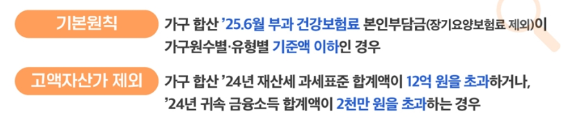 - 본인 부담 건강보험료 (장기요양보험료 제외)를 가구 구성원 합산한 금액이 선정 기준 이하이어야 지급 대상.