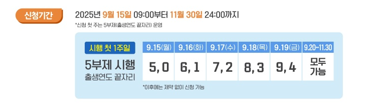 - 5부제 적용 기간(출생연도 끝자리 기준)은 신청 첫 주만, 이후엔 상시 신청 가능입니다.