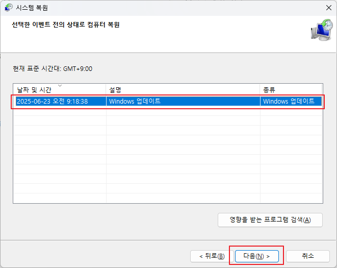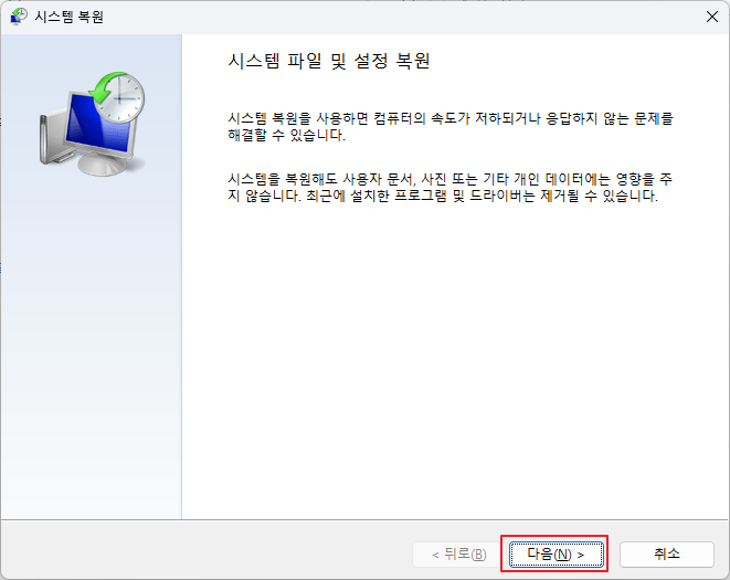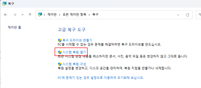 이전에 설정된 복원 지점이 있다면 해당 시점으로 복원하여 오류 전 상태로 되돌릴 수 있습니다.