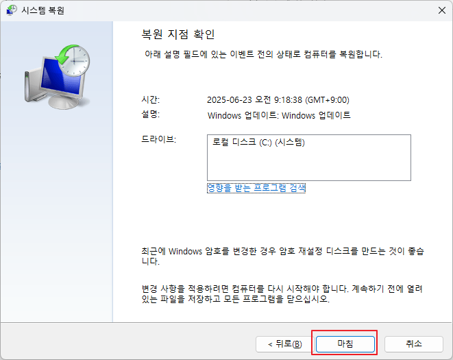 5> 마침 클릭하면 복원하면서 재부팅됨