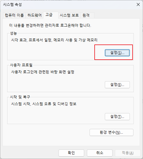 시각 효과는 사용자 경험을 돋보이게 하지만, 저사양 PC에선 부담이 됩니다. ‘시스템 → 정보 → 고급 시스템 설정 → 고급탭의 성능 부분의 설정 → 시각 효과 탭에서 최적 성능으로 조정 선택 → 확인 → 확인’ 을 해서 불필요한 애니메이션 효과를 줄일 수 있습니다.