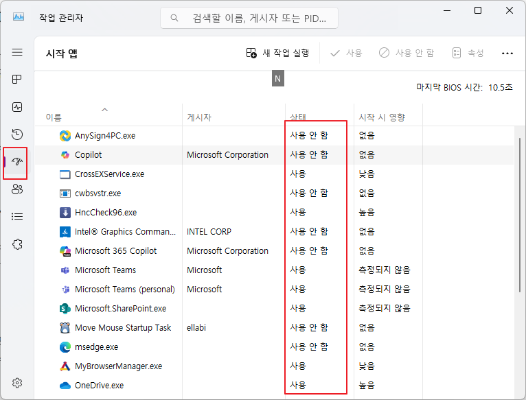 윈도우는 부팅 시 자동으로 실행되는 프로그램들이 많을수록 시작 속도와 초기 성능이 느려집니다. 작업 관리자(단축키 Ctrl + Shift + Esc)를 열고 ‘시작프로그램’ 탭에서 불필요한 항목을 ‘사용 안 함’으로 설정하세요.