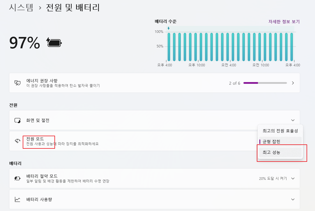 노트북 사용자라면 ‘전원 설정’을 고성능 모드로 변경해 보세요. ‘시작버튼 → 설정 → 시스템 → 전원 및 배터리 → 전원 모드’에서 최고 성능 모드를 선택하면 CPU 성능을 최대로 사용할 수 있습니다.