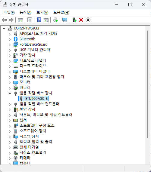 - ‘범용 직렬 버스 컨트롤러’ 항목에서 ‘알 수 없는 장치’ 또는 느낌표 표시된 장치 확인