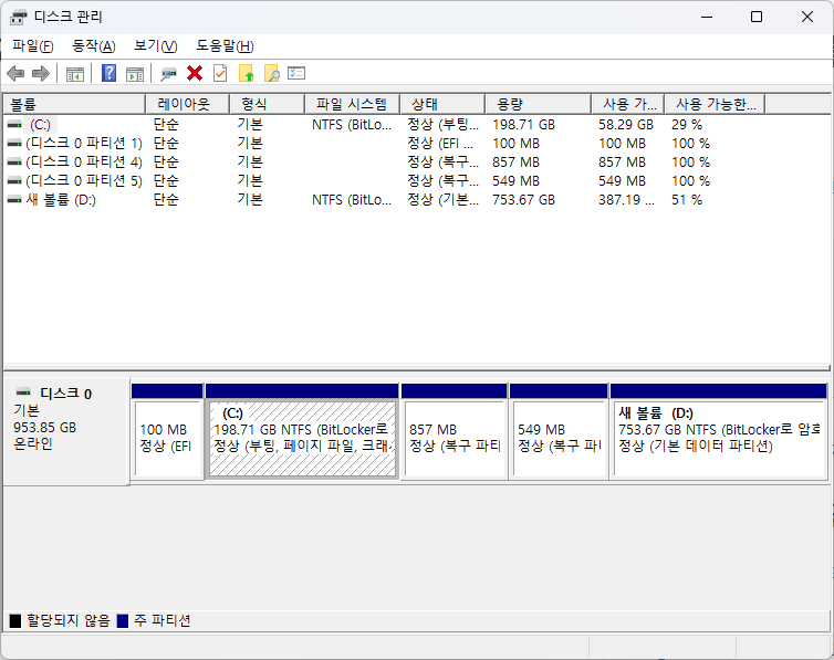 - 인식은 되지만 드라이브 문자가 없는 경우, 우클릭 → 드라이브 문자 및 경로 변경 → 추가